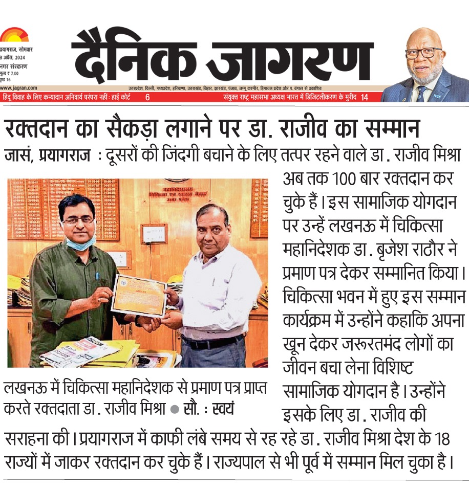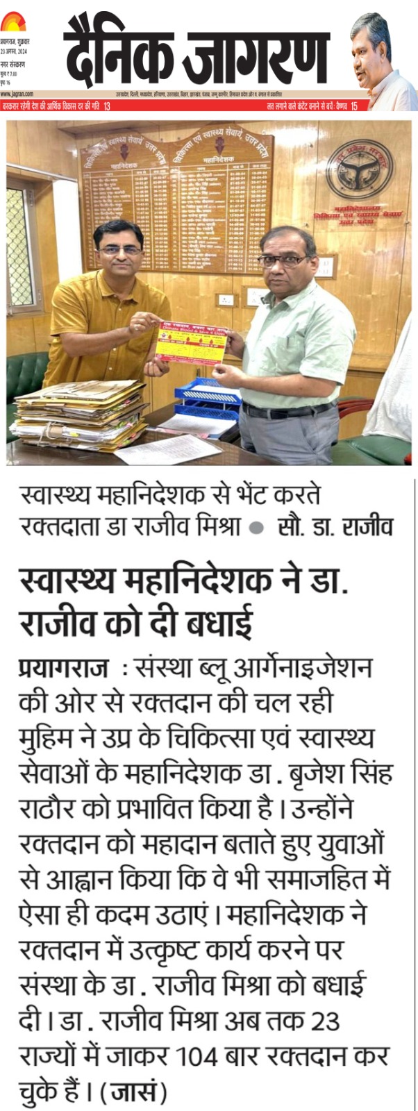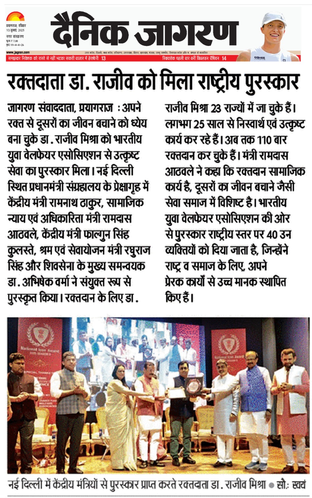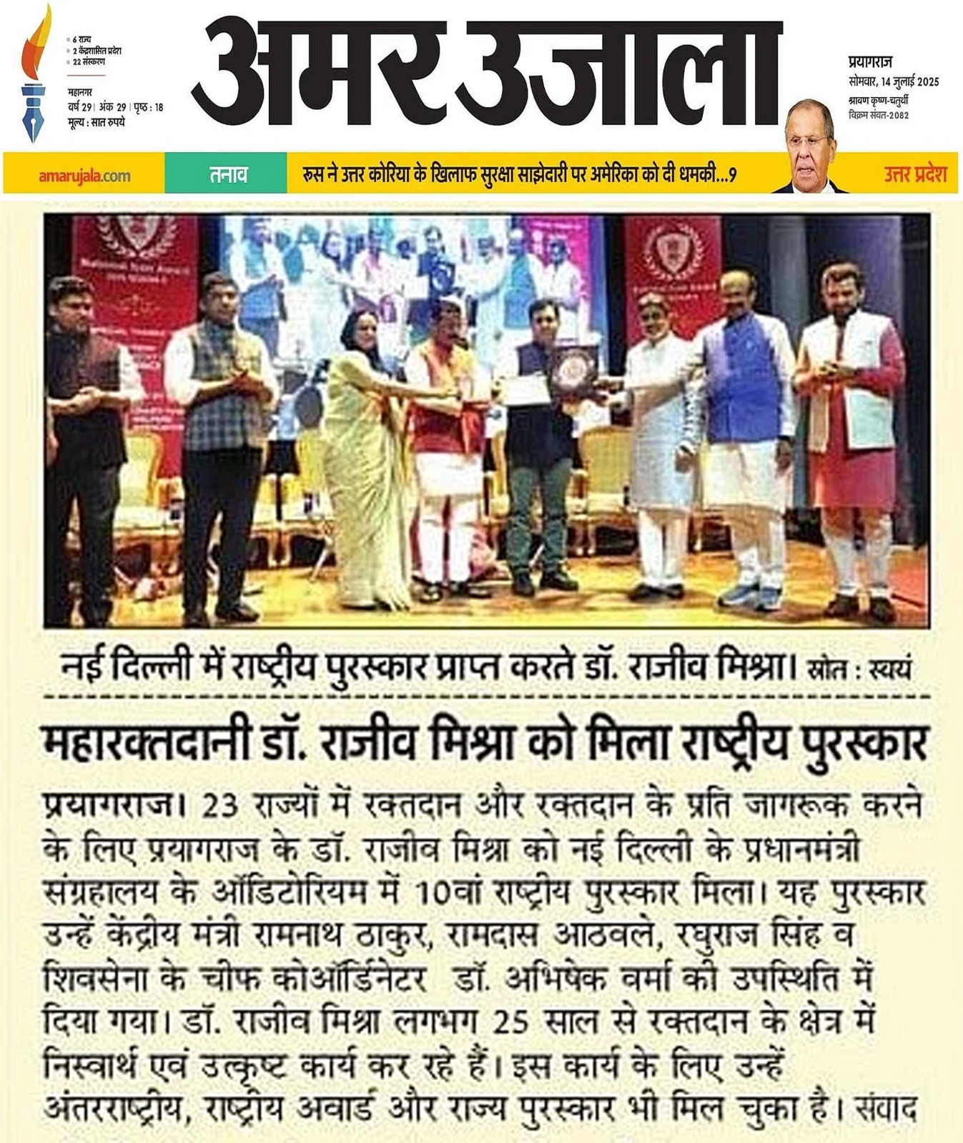 राष्ट्रीय रक्तदाता डॉ राजीव मिश्रा जिन्होंने रक्तदान और रक्तदान के प्रति जागरूकता हेतु देश के विभिन्न राज्यों में जैसे जम्मू कश्मीर,लेह लद्दाख, पंजाब,उत्तराखंड, हरियाणा, दिल्ली, उत्तर प्रदेश, बिहार,असम,नागालैंड की राजधानी कोहिमा, छत्तीसगढ़, कर्नाटक, गोवा, महाराष्ट्र, मध्य प्रदेश, भोपाल,राजस्थान के साथ-साथ महात्मा बुद्ध की जन्मस्थली लुंबिनी में जाकर रक्तदान करके देश और समाज युवाओं को रक्तदान के प्रति जागरूक करने का काम किया है! डॉ राजीव मिश्रा सभी त्योहार जैसे दिवाली, होली, दशहरा, नवरात्रि, 15 अगस्त,26 जनवरी, गांधी जयंती, के साथ-साथ अपना जन्मदिन भी अनाथालय में ही मानते हैं